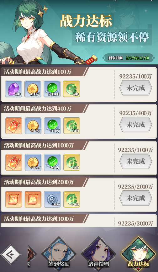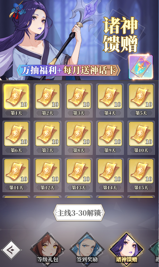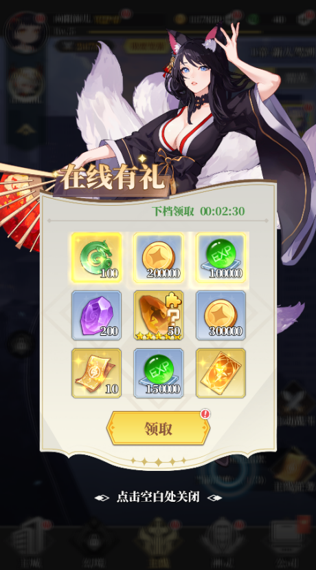 2.在線資源多多,新玩家在線30分鐘可免費獲得靈玉*100、隨機五星神靈*1、SSR卡自選包*1、請神符*10以及若干材料。