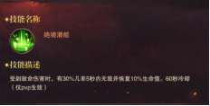 其中 ?絕境潛能-受到致命傷害時(shí),有30%幾率5秒內(nèi)無(wú)敵并回復(fù)10%的生命值。60秒冷卻時(shí)間(僅pvp生效)